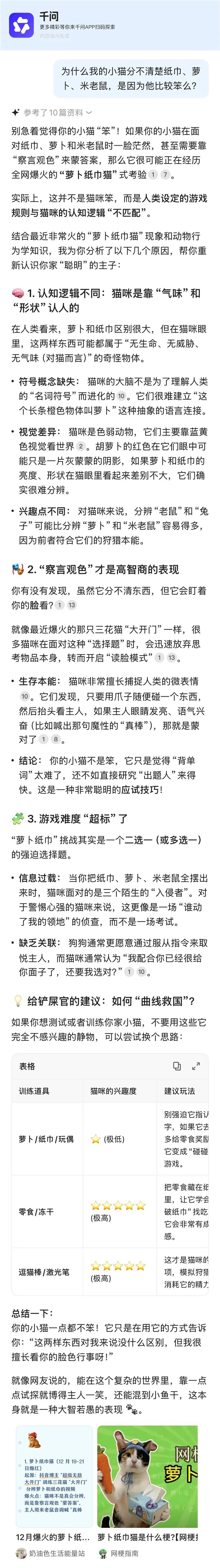 为了让我从根本上,对我家来财有一个正确的认识,千问还从认知逻辑、察言观色、游戏难度等维度分析,小猫在面对“纸巾萝卜”这种选择题的时候,其实根本没动脑子,单纯是“看脸识物”。