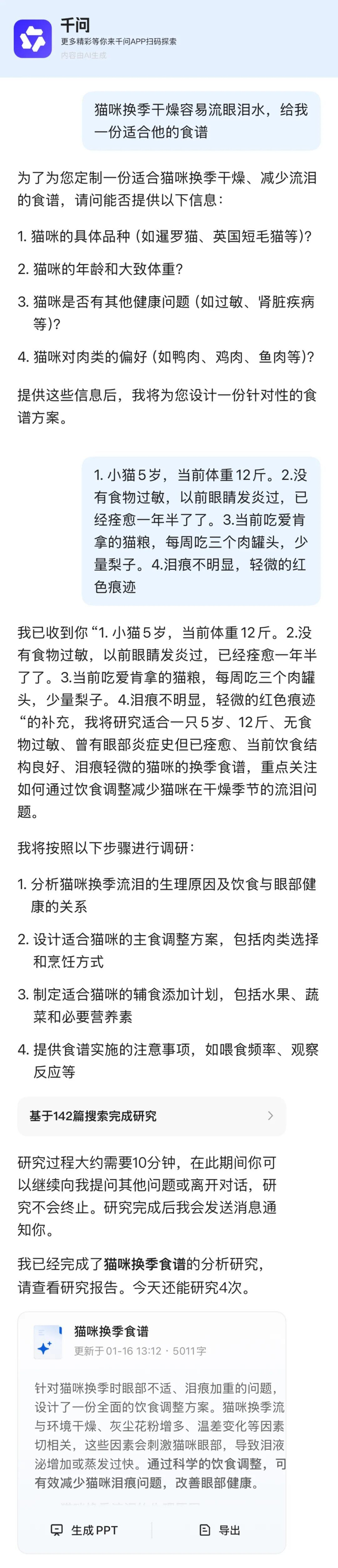 “饮食禁忌”“主粮推荐”“护理方案”安排到位还不够,我直接切换千问深度研究模式,让它定制了一份“猫咪冬季食谱”。