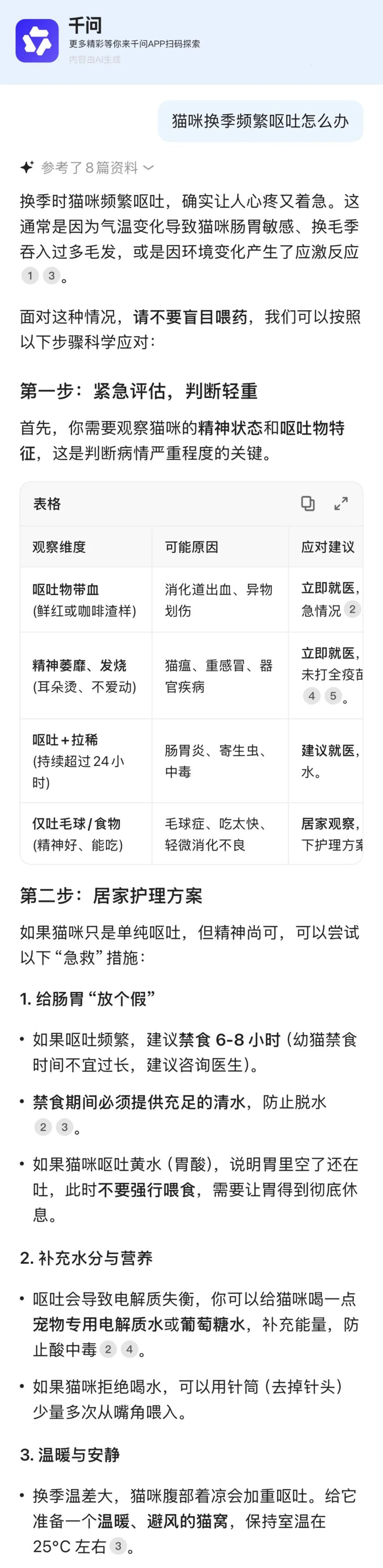 现在,很多新手养宠人已经学会,拍摄猫咪呕吐物发给千问,让它据此更具体、更专业地判断。如果只是单纯吐毛球,千问也可以根据实际情况,给出具体的指导建议,是健康调理还是就医。