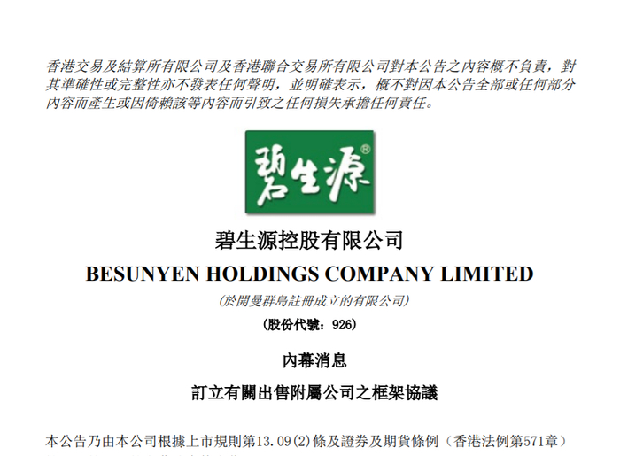 12月9日,碧生源发布公告,碧生源、碧生源间接全资附属子公司北京澳特舒尔与正嘉有限公司(简称“正嘉”)签订框架协议,北京澳特舒尔将出售北京申惠碧源云计算科技有限公司(简称“申惠碧源”)全部股权,各方同意按4.63亿元的对价推进。