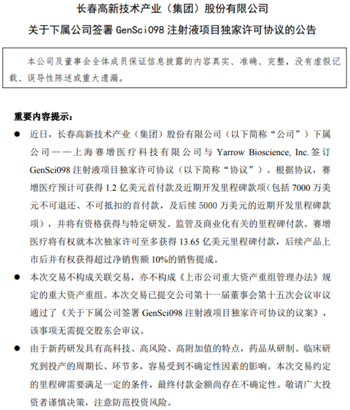 此外,赛增医疗将有权至多获得13.65亿美元里程碑付款,后续产品上市后并有权获得超过净销售额10%的销售提成。与此同时,赛增医疗还保留了GenSci098注射液产品在中国的开发与商业化权利。折算成人民币,长春高新这一重磅BD交易的总金额接近96亿元。