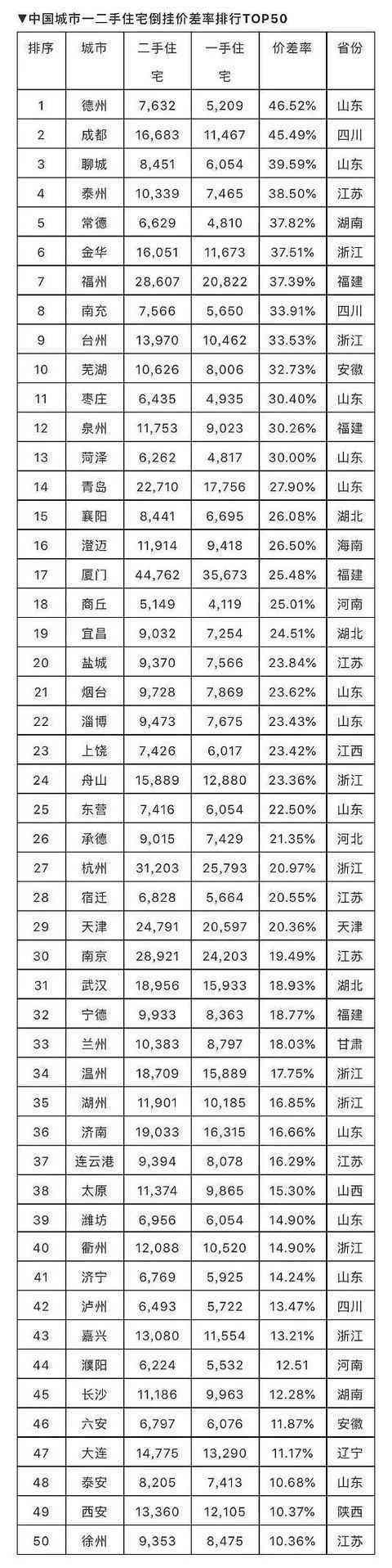 此外,如果换一种方式统计,不用价差“绝对值”表示,而采用一二手房“价差率”来表示的话,我们又发现,这其中除了没有一线大城市以外,却多了很多三、四线城市的身影。甚至,有很多我们都分不清到底是“城市”还是“县城”的地方,都赫然挤进,价格倒挂价差率排名前50位。