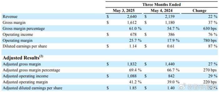 5月23日消息,模拟芯片大厂ADI(Analog Devices Inc.)于当地时间 22日公布了2025会计年度第二季(截至2025年5月3日)财报,受益于AI带动的模拟芯片需求,ADI第二季营收26.4亿美元,同期大涨22%,超越FactSet调查的分析师平均预期的25.1亿美元;调整后每股收益1.85美元,也优于FactSet调查的分析师平均预期的1.70美元。