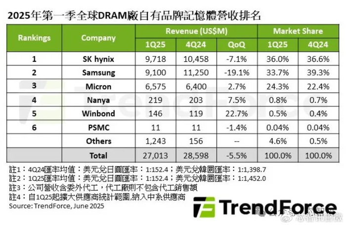 排名第三的是美光,受益于HBM3e出货规模扩大,即便售价微幅季减,营收仍达65.8亿美元,环比增长2.7%,市场份额达24.3%。