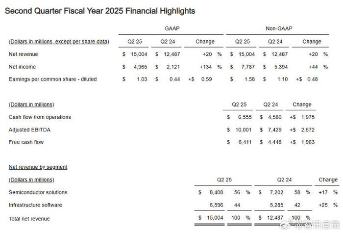 博通第二财季营收同比增长20%至150.04亿美元,略高于市场预期的149.6亿美元,也创下了历史新高;依照美国一般公认会计原则(GAAP) 净利润为 49.65 亿美元,同比暴涨134%;Non-GAAP 净利润为 77.87 亿美元,同比大涨44%;GAAP摊薄后每股收益为 1.03 美元,同比暴涨134%;Non-GAAP摊薄后每股收益同比大涨43.6%至为1.58美元,也略高于市场预期的1.57美元。
