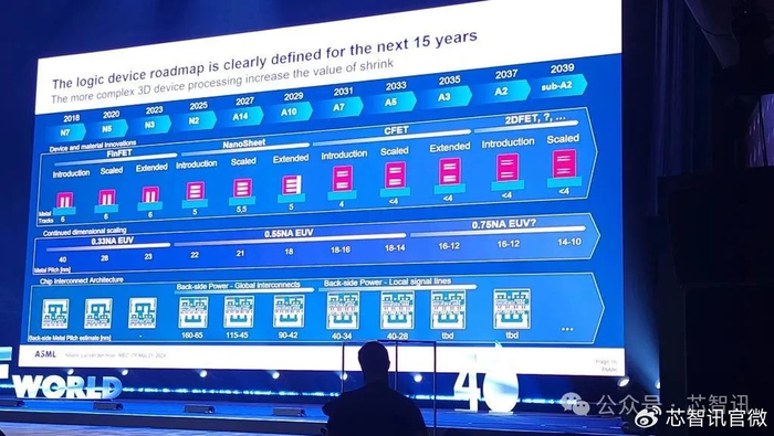 根据Martin van den Brink 此前披露的ASML未来15年的逻辑器件的工艺路线图来看,利用目前的0.3NA的标准型EUV光刻机支持到2025年2nm的量产,再往下就需要通过多重曝光技术来实现,但支持到2027年量产的1.4nm将会是极限。