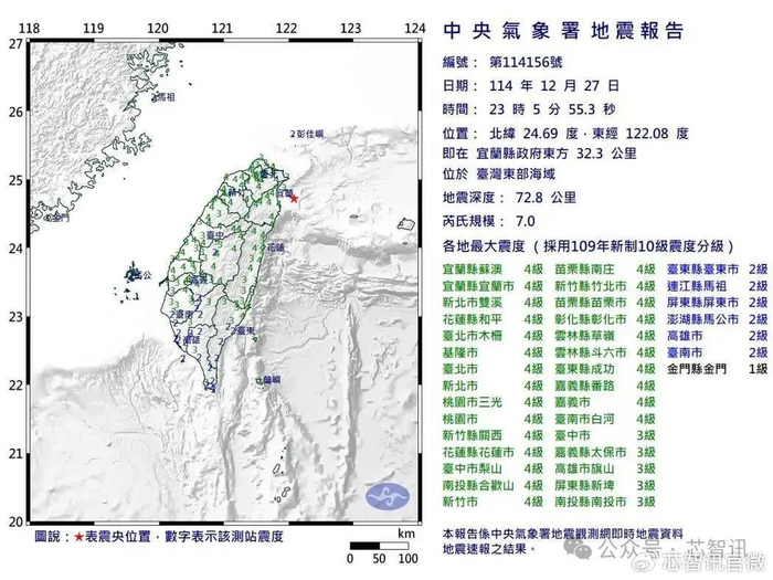 据中国地震台网测定,12月27日23时05分,在台湾宜兰县海域(北纬24.67度,东经122.06度)发生6.6级地震,震源深度60公里。