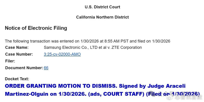 美国当地时间1月30日,美国加利福尼亚州北区地方法院做出正式裁决,驳回了韩国三星电子对中兴通讯发起的FRAND诉讼及反垄断。