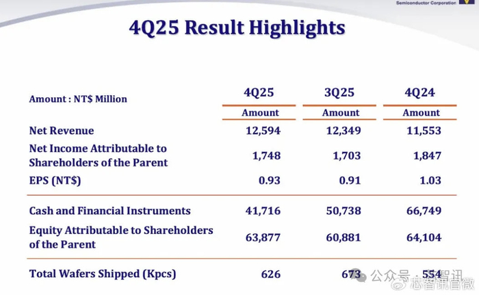 具体来说,世界先进第四季合并营收约为新台币125.94亿元,环比增长2%,归属于母公司股东净利约为新台币17.48亿元,每股税后收益约为新台币0.93元。世界先进表示,由于季节性需求减缓与供应链年底进行库存调整,第四季晶圆出货量较上环比减少约7%,产品平均销售单价环比增长约5%,毛利率上升0.7个百分点至27.5%,整体来说符合业绩展望。