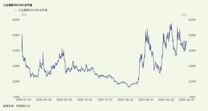 工业富联2018年在A股上市,上市即巅峰,市值最高也超过5000亿,而彼时全公司的利润也就不到170亿,差不多就是30倍的定价,对于代工企业来说,这个估值定价显然是不低的。