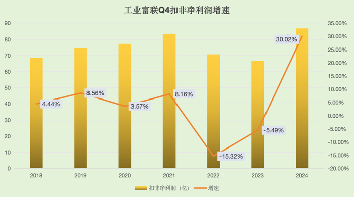 工业富联作为英伟达服务器的核心制造商,也算是在人工智能领域攫到了新的增长曲线。按照最新公布的年报来看,收入增长28%至6091.35亿,这也是首次突破6000亿,扣非净利润234亿,同比增长16%,最为重要的是Q4的扣非净利润同比增长30%,是近7年以来增速最高的四季度。