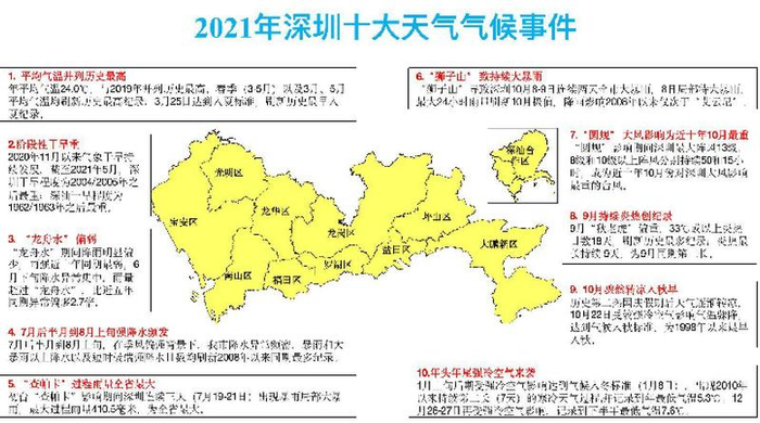 2022年1月18日,深圳市气象局发布了《2021年深圳市气候公报》,对2021年深圳全市(含深汕特别合作区)气象监测信息进行综合分析评估,公布了2021年深圳十大天气气候事件。