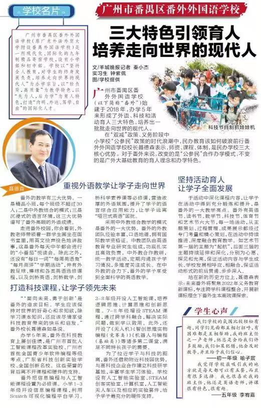 广州市番禺区番外外国语学校校长 聂德森广州市番禺区番外外国语学校(以下简称“番外”)始建于2018年,办学5年来形成了外语、科技和活动育人三大特色,培养出一批批走向世界的现代人。