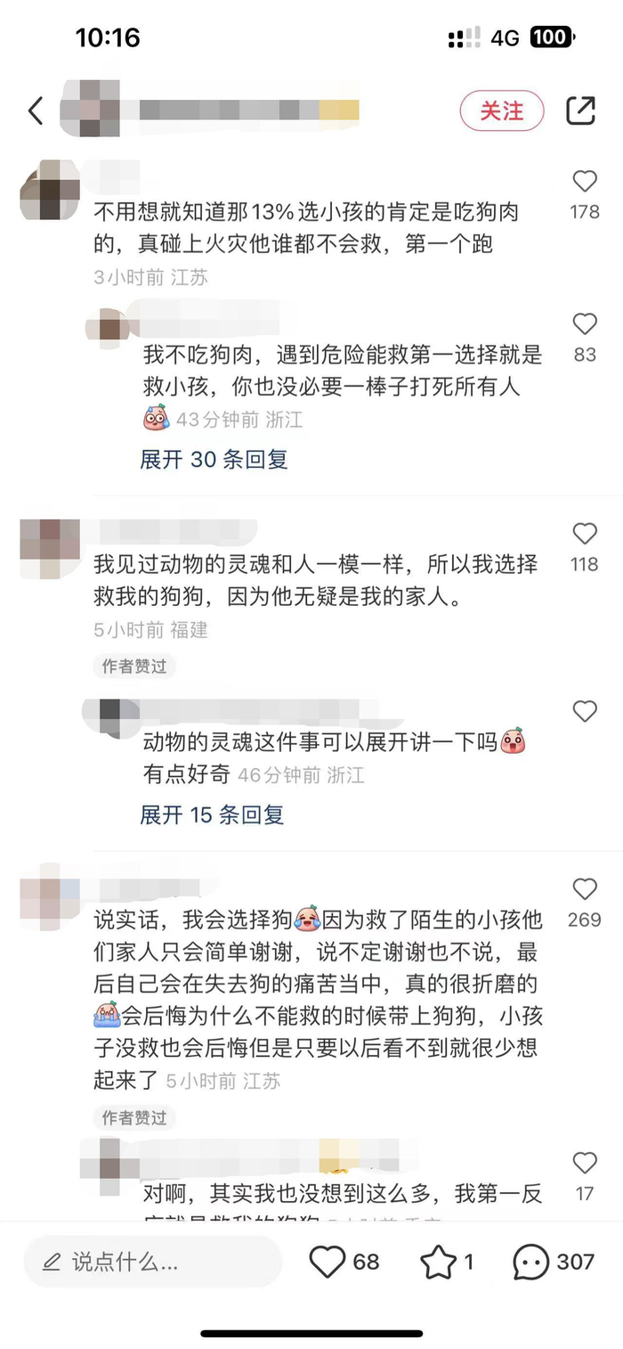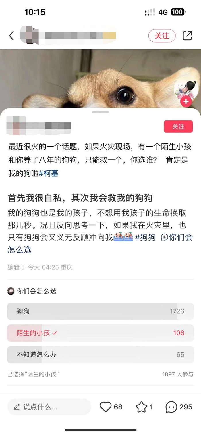 近期,这一与辩论节目《奇葩说》“救画还是救猫”相似的议论在网上掀起热议。记者发现,在某小红书博主的帖子下,参与投票的1897人里,有1726人选择救狗,只有102人选择救人,这一结果让不少人感到惊讶。
