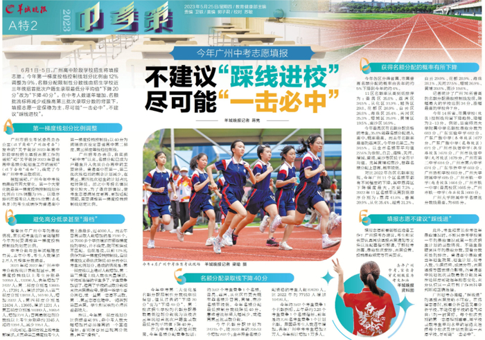 6月1日-5日,广州高中阶段学校招生将填报志愿。今年第一梯度投档控制线划分比例由12%调整为9%,名额分配限制性分数线由招生学校近三年统招首批次户籍生录取最低分平均值“下降20分”改为“下降40分”。在中考人数逐年增加、名额批流标将减少或推高第三批次录取分数的背景下,填报志愿一定保稳为主,尽可能“一击必中”,不建议“踩线进校”。
