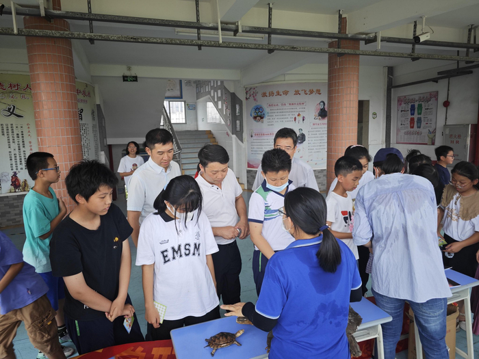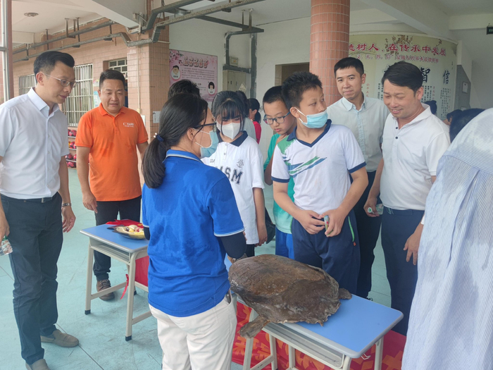 协办单位全国科普教育基地珠江水产研究所也设置了摊位,摊位桌子上摆放着了鼋和龟的活体标本,以及鱼的器官组合模型,吸引学生们驻足饶有兴致地观看。