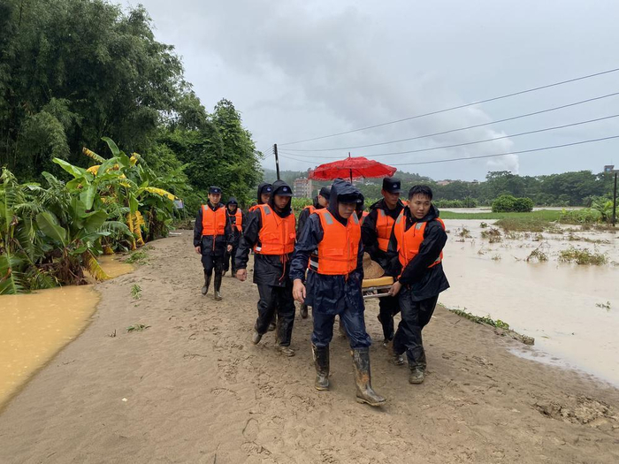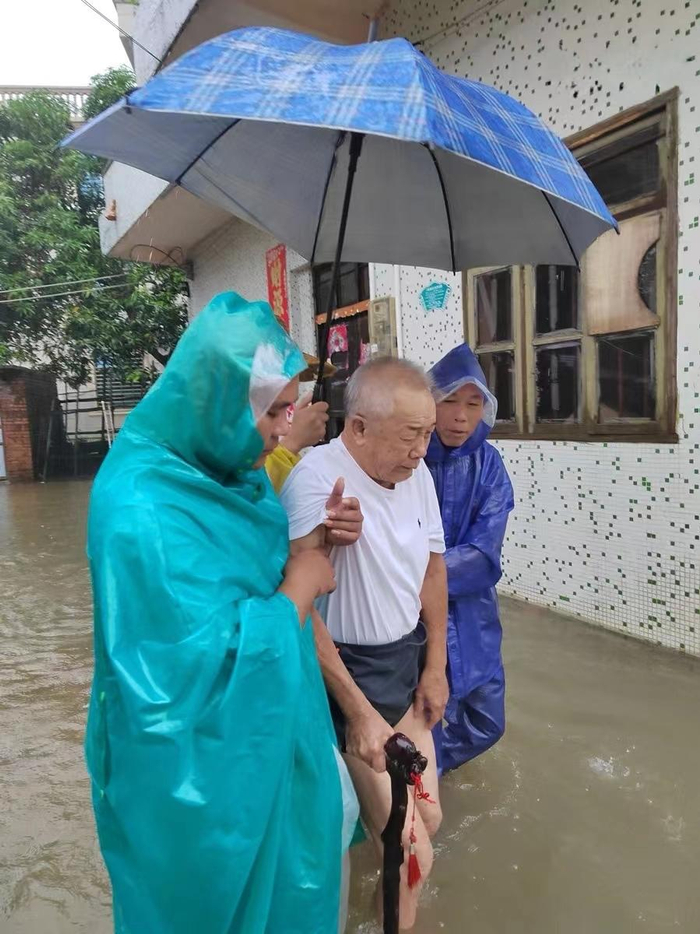 在黄岭镇,受暴雨影响,白石河水位急涨,临江的白石村委会角仔园村由于地势低洼,河水倒灌,出现险情,有10户33人需要紧急转移。从10日凌晨1时开始到12时,当地党委、政府和派出所、巡警大队、应急等部门联合对涉险区域的全部群众进行转移,截至当天12时,已经安全转移9户29人,还有4人在转移中。其中,有两名八旬老人因身体原因行动不便,为确保安全,电白警方使用担架扛抬的方式将老人安全转移出去。