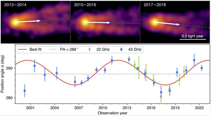 这项工作使用了包括东亚VLBI网(EAVN)、美国的甚长基线阵列(VLBA)、韩国KVN和日本VERA联合阵列(KaVA)以及东亚到意大利/俄罗斯联合的EATING观测网在内的多个国际观测网络的170个观测数据,全球超过20个射电望远镜为这项研究做出了贡献。科研人员通过分析最近23年来的VLBI观测数据,成功地捕捉到M87中喷流的周期性进动。