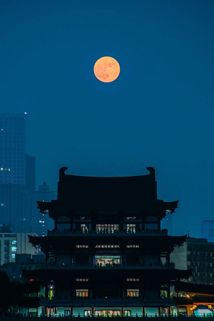 江西九江,中秋圆月与德化楼同框。