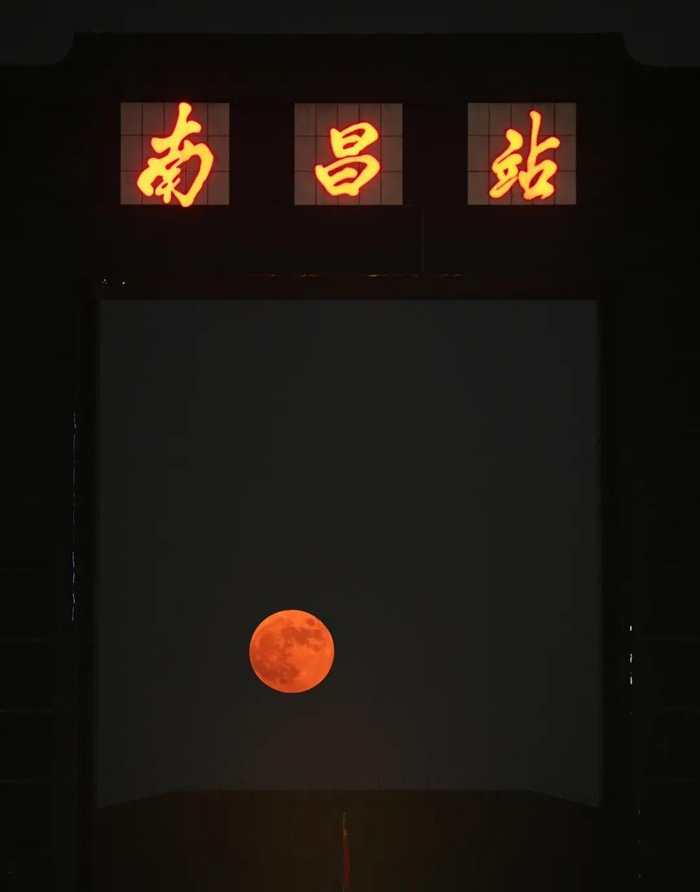 江西南昌,圆月与南昌火车站同框。
