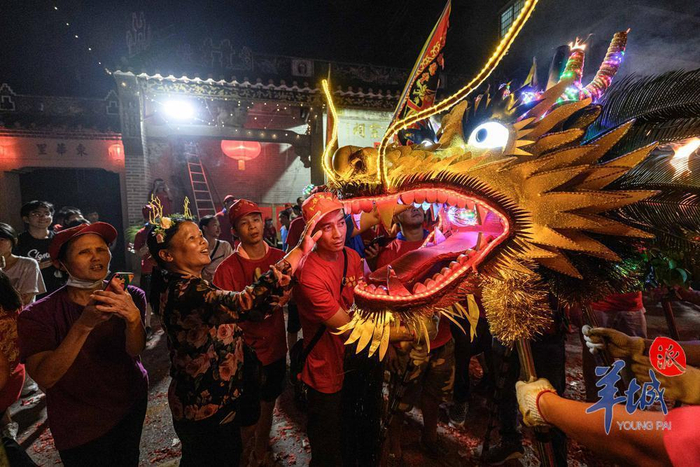 村民舞动着“火龙”在清湖村内巡游当晚6点,记者手持均禾街各个村落的舞火龙巡游路线图和活动流程图,开启了舞火龙欢乐打卡之旅。最热闹的还数清湖村,晚上6点到7点是“点睛醒龙仪式”,为火龙开光点睛,随后进行采水、起龙等仪式。起龙之时,村民们倾巢而出,争睹盛况。晚上7点半到8点半,在各祠堂周边进行火龙炫舞,随后火龙各自巡拜祈福,祈愿风调雨顺,红红火火。9点半,“龙腾万家——火龙巡游仪式”四龙汇聚巡游至清湖牌坊开始炫舞表演。威武的龙头抖动与旋转着,龙身和龙口喷出耀眼的火花,龙角、龙眼和龙须都闪耀着灯光,火龙时而腾起,时而俯冲,在舞龙壮汉们的齐声呐喊中翻腾,火龙所到之处,锣鼓喧天,人声鼎沸,夜空如昼,家家欢腾。
