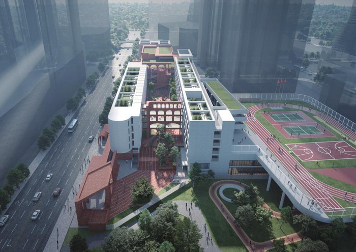 学校效果图燕贻学校建筑设计融合历史沉淀和现代文化的元素,以具有历史意味的红砖拱券,承载新校园的“历史”内涵,以纯粹简洁的几何形体隐喻新校园的“未来”属性,让“历史”与“未来”在这里相遇,打造符合地域和时代特色的校园新形象。