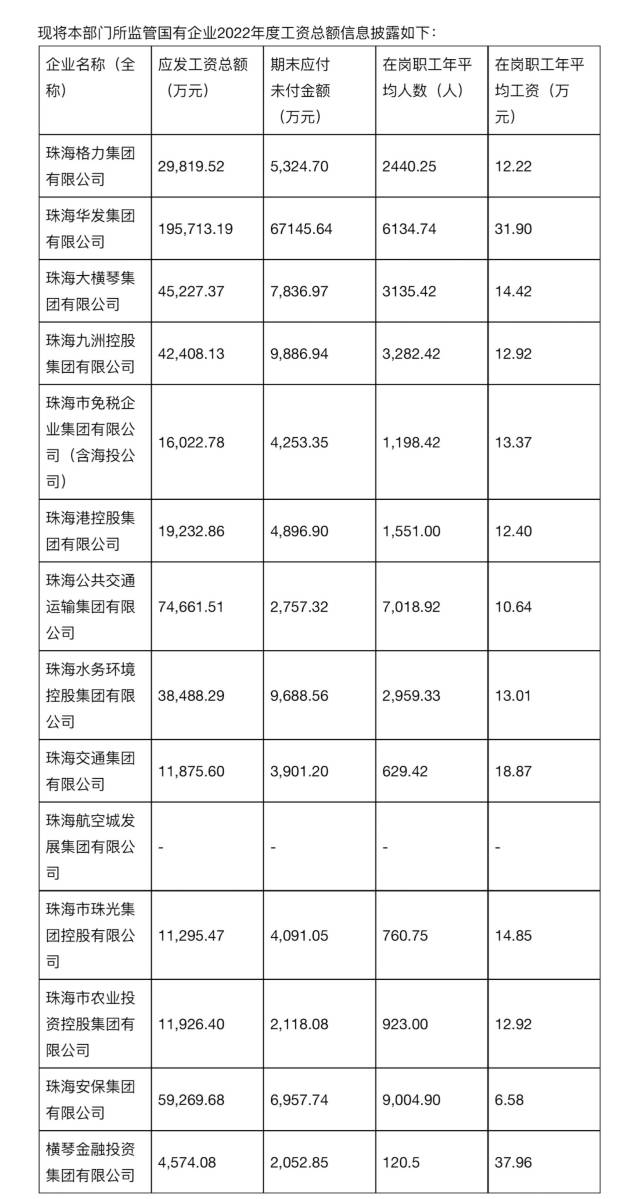 近日,珠海市国资委官网披露了2022年珠海市国资委所监管国有企业工资总额信息。其中,珠海华发集团有限公司在岗职工年平均工资为31.90万元,横琴金融投资集团有限公司在岗职工年平均工资为37.96万元。