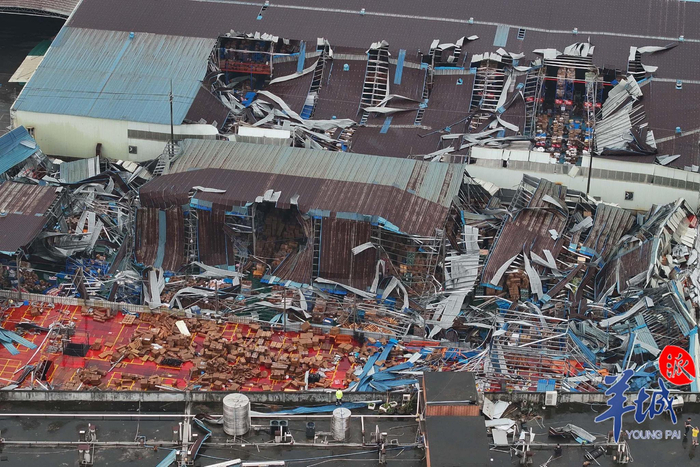4月27日,广州市白云区钟落潭镇遭遇龙卷风极端天气,一家具厂厂房被吹翻 钟振彬 摄多个气象条件导致4月异常偏多雨量