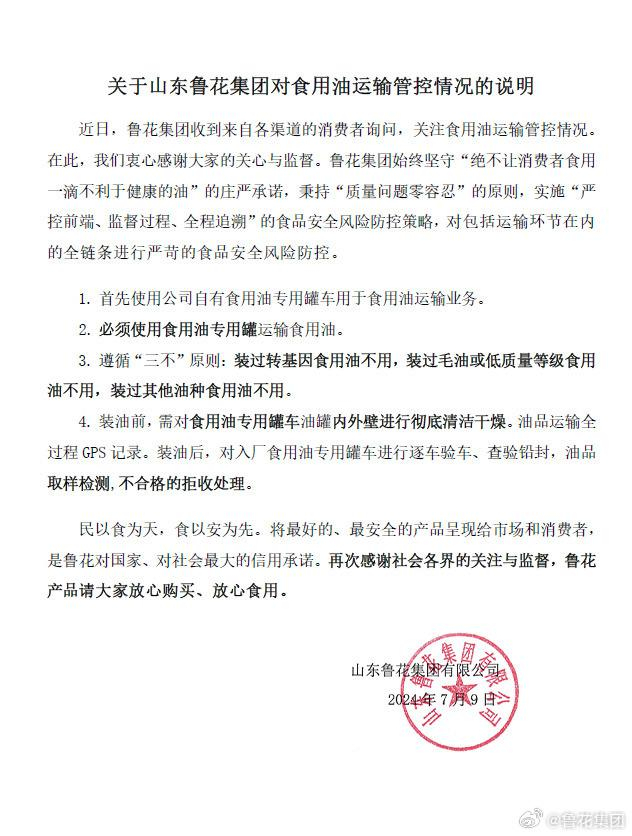 7月9日,针对“油罐车运输乱象”事件,鲁花集团官方微博发布声明回应称,集团对包括运输环节在内的全链条进行严苛的食品安全风险防控,首先使用公司自有食用油专用罐车用于食用油运输业务;必须使用食用油专用罐运输食用油;遵循“三不”原则:装过转基因食用油不用,装过毛油或低质量等级食用油不用,装过其他油种食用油不用;装油前,需对食用油专用罐车油罐内外壁进行彻底清洁干燥,油品运输全过程 GPS 记录;装油后,对入厂食用油专用罐车进行逐车验车、查验铅封,油品取样检测,不合格的拒收处理。