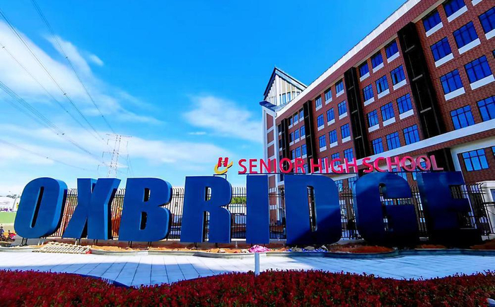黄广牛剑高级中学标识走进校园可见“OXBRIDGE”巨幅标识。“OXBRIDGE”彰显着黄广人凝聚智慧、集合力量打造黄广牛剑高中高质量人才出口的目标与决心:为孩子们搭建“1(境内高考)+6(多元出口)”的学校,培养具备“中国心+世界眼”的高质量学生。