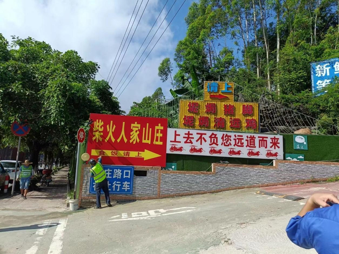 拆除户外广告和招牌设施照片(前)全面整治了银英公路和清佛公路主干道沿线两侧的违规户外广告和招牌设施,清拆和美化施工工地围挡,整治了重点路段占道经营和清理乱堆放物品,并要求重点场地建造围墙和设置大门。通过开展主干道整治行动,该镇取得了阶段性成果,城乡面貌焕然一新。