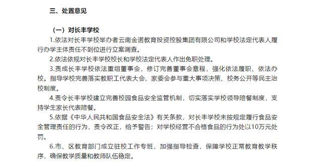 官方通报宣布对长丰学校校长作出免职处理。“昆明官渡发布”微信公众号“昆明官渡发布”发布的情况通报中,介绍了臭肉的来源以及原因,同时对涉事的餐饮企业存在管理不到位、资质不全等问题进行了处罚。对于这部分处理结果,两位家长都没有提出异议。