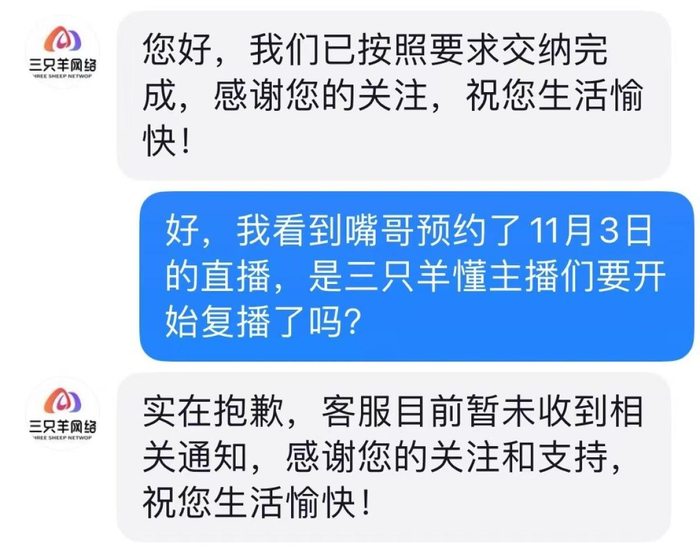 此外,记者关注到,三只羊公司旗下知名主播“嘴哥”预约了11月3日晚上9时的直播,嘴哥目前粉丝数量为960.8万,这也将是他自9月12日以来首次开播,其账号信息中有“MCN三只羊”标识,三只羊公司客服称,目前暂未收到直播开播的相关通知。