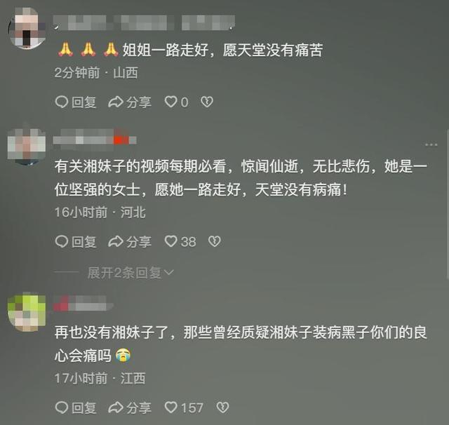 “看到别人发的视频说湘妹子走了,我还不相信,赶紧看看她的号,坚强的湘妹子真的走了,一路走好。”