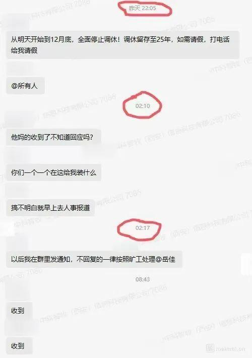 网传聊天截图显示,事发当晚10点5分,有人发出“全面停止调休”的信息并@所有人,但未见有人回复。次日凌晨2点10分,有人再次发出“他*的收到了不知道回应吗?”“你们一个一个在这给我装什么”“搞不明白就早上去人事报到”等信息,后又在2点17分发出“以后我在群里发通知,不回复的一律按照旷工处理”。直至8点43分,有人回复“收到”。
