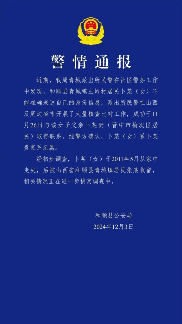近日,“女硕士患精神疾病失踪十余年被找回”一事引发广泛关注。12月3日,山西晋中和顺县公安局发布警情通报称,“经初步调查,卜某(化名)于2011年5月从家中走失,后被山西省和顺县青城镇居民张某收留,相关情况正在进一步核实调查中”。