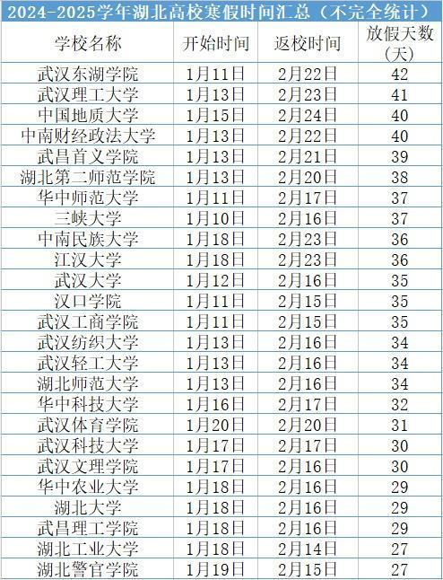 2024-2025学年湖北高校寒假时间汇总(不完全统计)就放假时长而言,武汉东湖学院放假42天,目前来看,这是今年湖北省寒假假期最长的大学。假期大于等于40天的湖北省高校有武汉东湖学院、武汉理工大学、中国地质大学和中南财经政法大学。湖北警官学院和湖北工业大学放假时长最短,仅为27天。