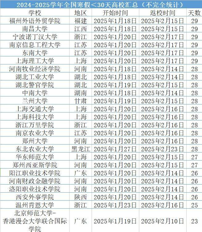 2024-2025学年全国寒假<30天高校汇总(不完全统计)湖北省内已经公布放假信息的学校中,三峡大学于1月10日率先开始放假,成为今年湖北省最早放寒假的大学,中国地质大学则最晚开学,学生于2月24日才返校。武汉体育学院1月20日才开始放假,是今年湖北省最晚开始放寒假的大学,湖北工业大学则于2月14日就开始返校,是湖北省最早开学的大学。