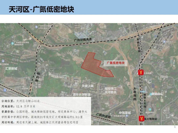 广氮低密地块 图源:广州市规划和自然资源局天河区最值得关注的当属广氮板块的一宗低密地块,吹风会上,该宗地以天河区-广氮低密地块的名称向外展示,宗地面积高达12.8万平方米,周边已有天河壹品、保利天汇等一手项目在售。作为低密地块,有可能将供应近年来中心区域极为罕见的一手墅类住宅。