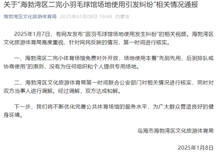 2025年1月7日,有网友发布“因羽毛球馆场地使用发生纠纷”的相关视频。海勃湾区文化旅游体育局高度重视,针对网民反映的情况,第一时间进行核实。