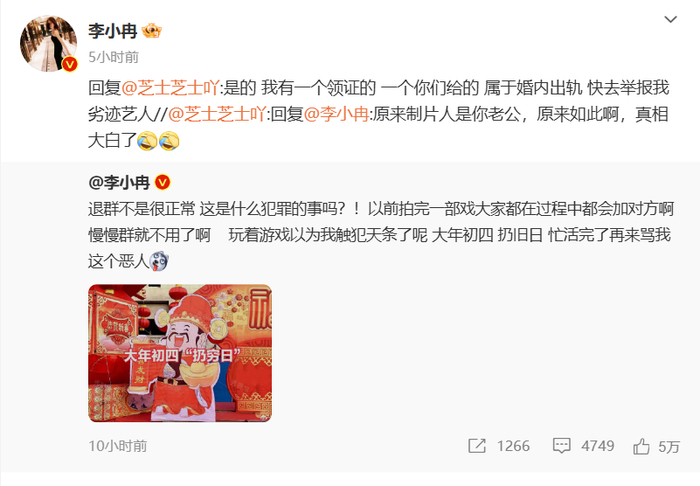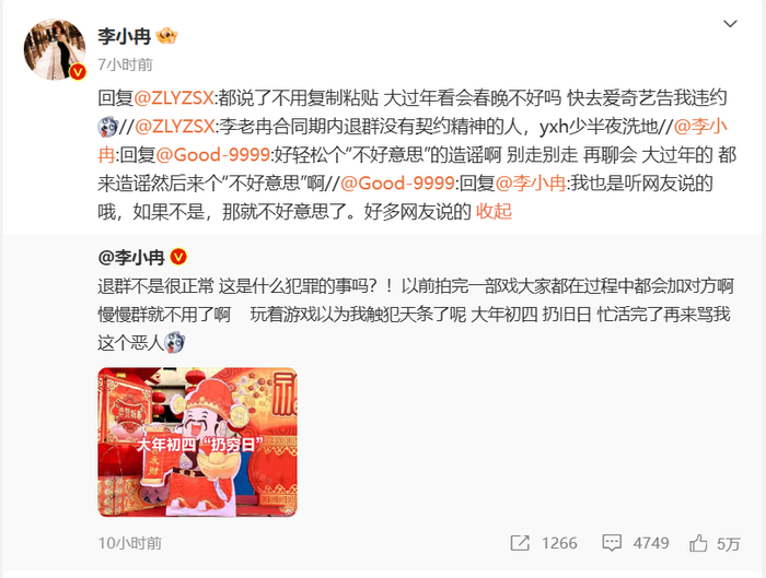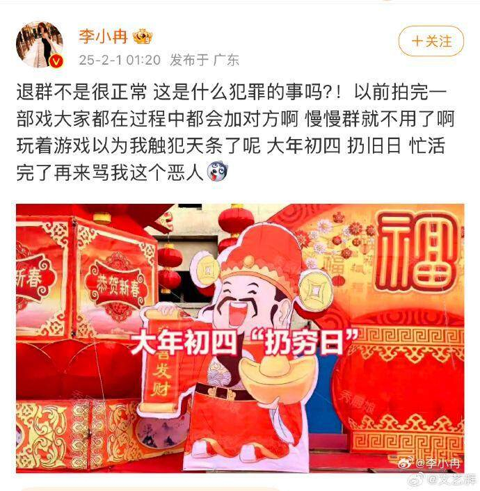 2月1日凌晨,李小冉发文回应:“退群不是很正常,这是什么犯罪的事吗?!以前拍完一部戏大家都在过程中都会加对方啊,慢慢群就不用了啊。玩着游戏以为我触犯天条了呢,大年初四,扔旧日,忙活完了再来骂我这个恶人”。