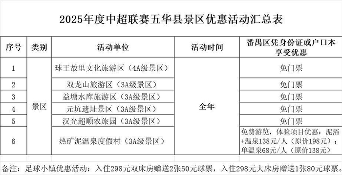 热矿泥温泉度假村(3A级景区)也加入了这场优惠“狂欢”。番禺居民不仅可以免费游览,其体验项目更是有大幅优惠:泥浴+温泉套餐仅需138元/人(原价198元),单温泉体验68元/人(原价138元)。值得一提的是,足球小镇也推出了特色优惠活动,番禺居民入住298元的双床房,即可获赠2张50元中超梅州客家队主场球票;入住298元大床房,则可获赠1张80元中超梅州客家队主场球票,让番禺老兄在游玩景区的同时,感受中超赛事的热烈氛围。