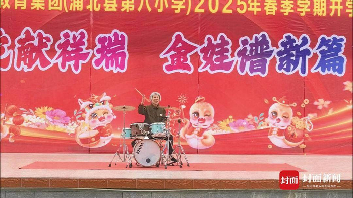 一头灰白色短发,一身棕色工装夹克,音乐响起,舞台上的老人自然摆动身体,鼓棒也在指尖自由转动起来……2月16日,69岁的杨奶奶参加了孙女就读小学的开学典礼,不是作为家长,而是表演嘉宾。