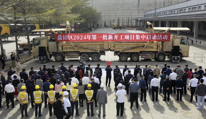 去年2月、龙年春节假期结束后刚开工,在深圳盐田区,两辆工程车“背靠背”,车上挂着一条横幅,便搭建起了一个简易的开工现场。现场没有大展板,也没有垫红毯,最显眼的物料是这样一条横幅。当天,除盐田区外,福田、罗湖、龙华等区也纷纷动起来,打响新春开工“第一炮”。