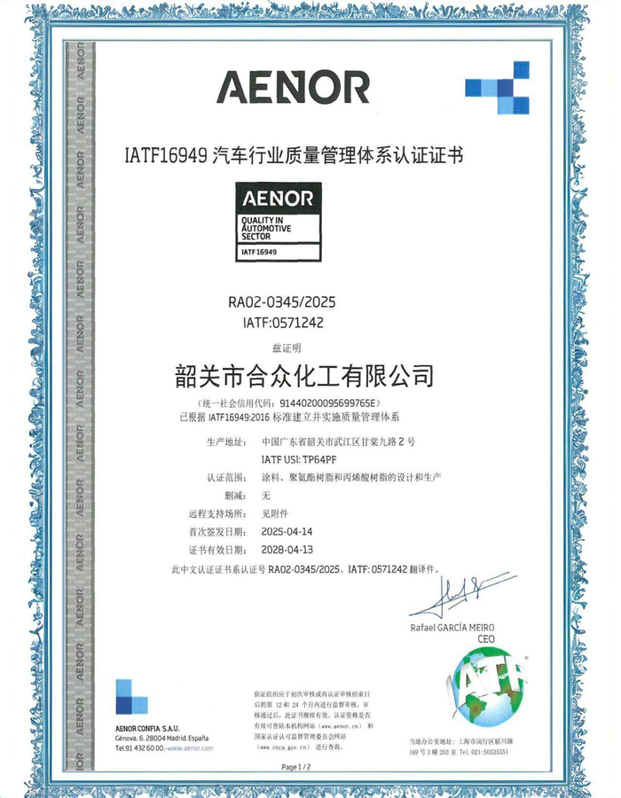 日前,韶关高新区企业韶关市合众化工有限公司成功通过IATF16949汽车行业质量管理体系认证,标志着公司在汽车相关产品的研发、生产与服务等方面达到了国际认可的高质量标准。