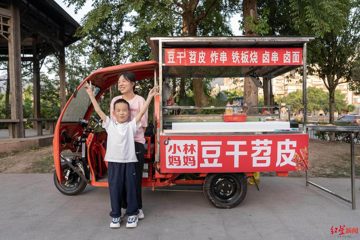 2023年,林静生下女儿汐汐。刚出月子,林静就带着两个孩子出门摆摊卖小吃。起初卖卤串,后来推着小餐车卖烧烤。林静大多数时候会在大河坝公园摆摊。公园里有一个儿童乐园,天气好时很热闹,淼淼可以在那和其他孩子一起玩。