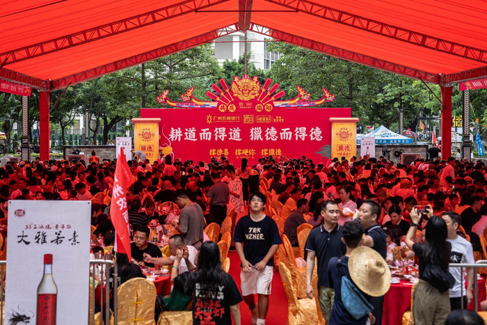 云闪付平台U惠广东“同船渡·粤韵广州”——“2025撑德喜·猎德千围龙舟宴”活动页面显示,80元一位的猎德龙船饭就餐时间为5月31日(农历五月初五)至6月2日晚6时。而猎德招景龙船饭是在5月31日中午。“我们村的龙舟手还有来‘探亲’的兄弟村龙舟手都是中午扒完龙船吃饭,不在晚上吃的。”猎德村民明哥说。