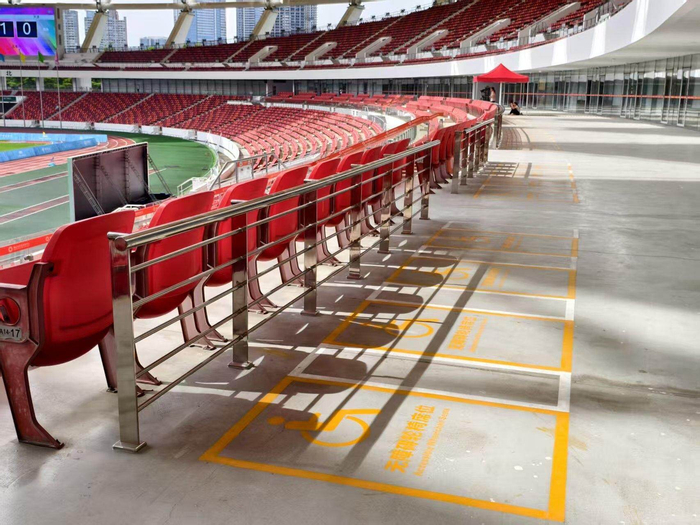 无障碍轮椅席位“为确保观赛与竞技实现硬件设施无障碍、信息无障碍和服务无障碍,我们从去年10月启动了无障碍设施改造工作,至今年5月完成了全部建设和优化。”佛山市体育场馆中心副主任杨健表示,为营造赛事氛围,场馆还在运动员休息区、竞赛区等重点区域精心布置,希望激励运动员们发挥最佳状态,也让他们感受到佛山的热情与欢迎。
