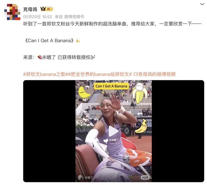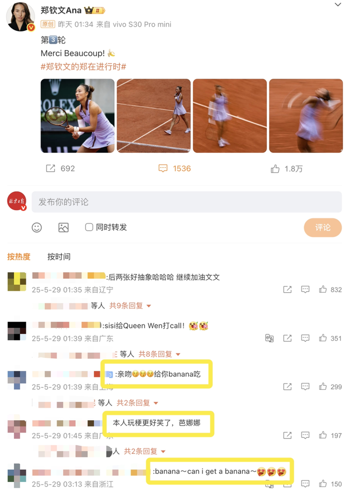 郑钦文在个人微博中也玩起了梗:"Merci Beaucoup(法语:非常感谢)!🍌"