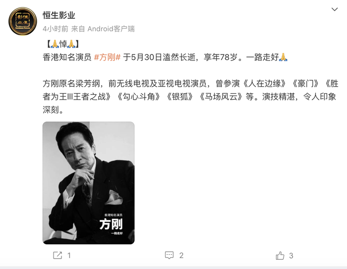 5月31日,恒生影业发布消息,香港知名演员方刚于5月30日溘然长逝,享年78岁。